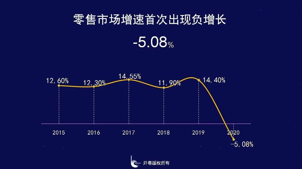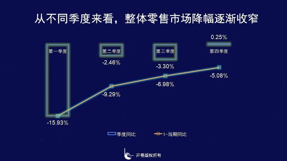 2020年整体零售市场前3个季度降幅逐渐收窄,第四季度转为正向增长2020年作为特殊的一年,除了关注整年市场趋势外,我们也重点聚焦一下各季度市场增长情况。2020年整体零售市场同比下降了5.08%,我们拆分到不同季度来看,第一季度受疫情影响最为严重,同比下降15.93%,进入第二季度后,随着逐渐复工复产以及复学,第三季度同比下降3.3%,降幅明显收窄,到第四季度整体零售市场有所回暖,同比出现小幅上涨,上升了0.25%。