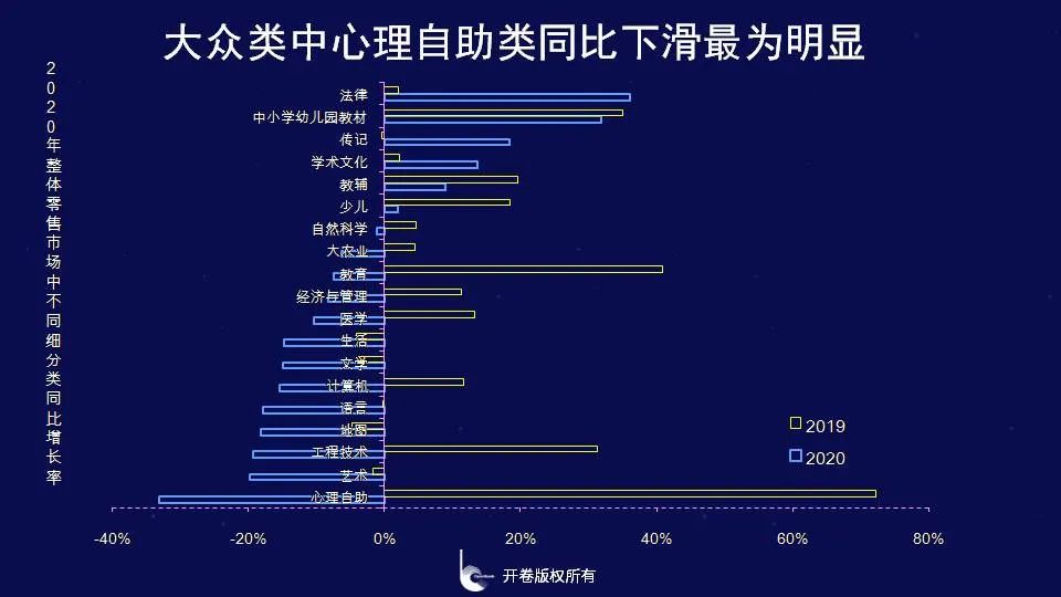 从不同细分市场来看,整体零售市场中除主题出版相关门类、学习刚需类以及少儿类外,其余门类均出现同比下滑,其中心理自助类同比下降了33.24%,降幅最为明显,主要是因为2019年受抖音带动的成长励志类图书销量回归正常。少儿和教辅类虽然实现了正向增长,但增速相较2019年明显放缓。此外,2019年正向增长的工程技术、计算机、医学、经管、教育、大农业和自然科学类在2020年转为负增长。