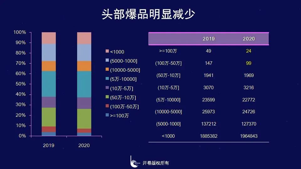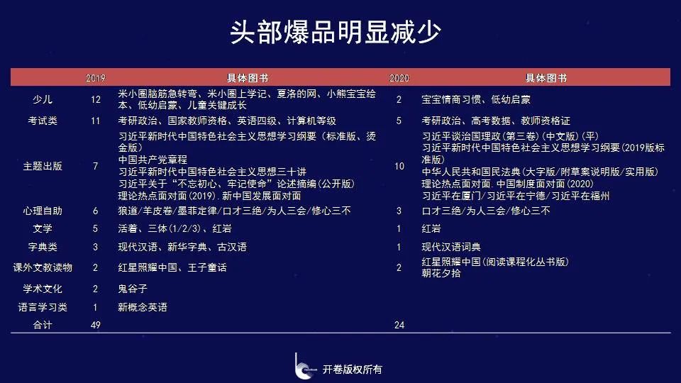 从整体市场的头部图书来看,2020年销量在百万以上的图书品种明显减少,从2019年的49种下降至2020年的24种,少儿类2019年有12个品种销量在100万册以上,2020年有2个品种,减少的主要是少儿文学“米小圈”系列图书。考试类和2019年相比减少了6个品种;2019年抖音带火的上百万册图书除了《修心三不:不生气不计较不抱怨》《为人三会:会说话会办事会做人》《口才三绝:会赞美会幽默会拒绝》外,其他《狼道》《鬼谷子》《羊皮卷》《墨菲定律》2020年销量大幅下降;同样2020年受学校延迟开学的影响,2019年销量上百万级的语言学习类和工具书类也有所减少。