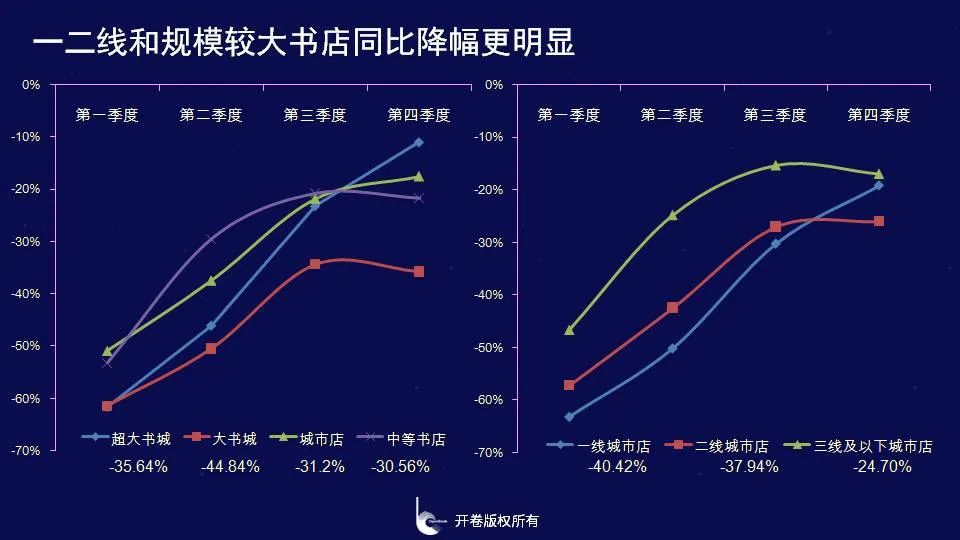 从不同类型书店来看,一二线城市以及超大书城类同比下滑严重,全年同比降幅均在35%以上,从不同季度来看,不同类型书城和整个实体店渠道趋势变化类似,但是相较于二线及以下书店以及中小型书店,一线城市书店以及超大书城恢复能力更强,到第四季度超大书城同比降幅收窄至10.96%,和第三季度相比,降幅收窄13个点。而其他类型书店相较于第三季度,成长性变化不大。