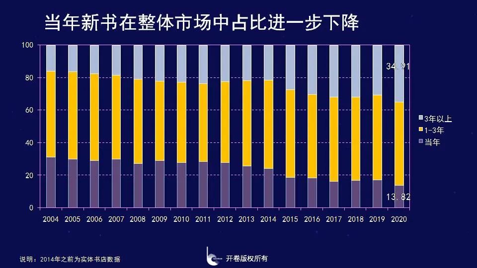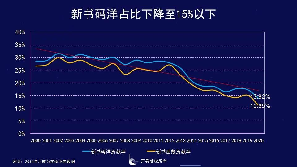新书驱动力不足2020年,新书品种规模达17万种,较2019年同比下降了近12%,除了行业自身在追求高质量发展外,受疫情影响品种规模进一步收缩。出版行业作为以内容为基础的行业,是靠内容驱动的市场,新鲜的内容不仅为行业注入新鲜的血液,同时也为未来注入了希望。近些年,我们通过观察新书的占比情况,发现新书对整体市场的贡献在不断下降,无论是新书码洋还是新书册数,在整体市场中所占的份额均越来越小。新书码洋贡献率2008年开始降到30%以下,之后一直呈现下降态势,在2015年下降到20%以下,而在2020年新书码洋贡献率进一步下降至13.82%。
