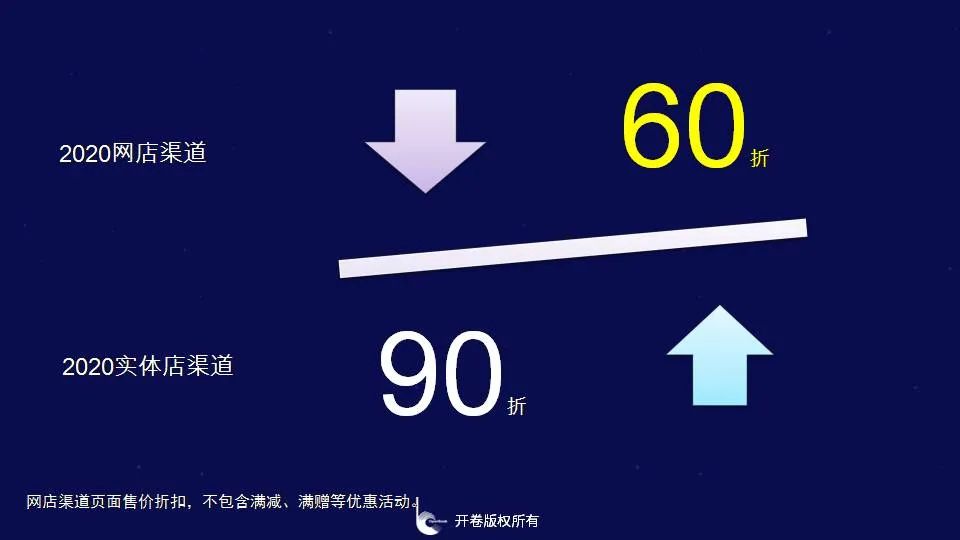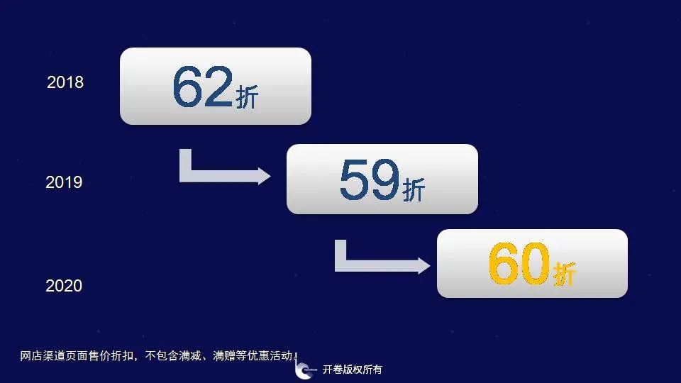 将整体市场中图书总动销情况按照上市时间来划分,老书在市场中所占的比重进一步上升,可以说老书在市场中发挥着越来越重的作用。此外,我们从畅销书上也能看出,新书的影响力在不断减弱,进入三大榜前10名的新书越来越少,2020年少儿榜和虚构榜中没有新书进入前10名,非虚构中有1本《国家安全知识百问》,而从新进入榜单的图书来看,主要是主题出版和畅销作者或畅销系列的新作。2020年可谓是新营销方式百花齐放的一年,但我们可以看到新品表现并不突出,这说明新书的驱动力以及内容供应的有效性其实在下降,这点值得行业深思。线上线下折扣差异大,网店渠道60折