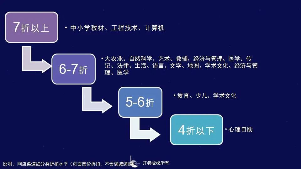 进一步聚焦细分类市场的折扣水平,和2019年相比细分类折扣水平变化不大,但不同细分类折扣水平依然有着明显差异,网店渠道中,绝大多数类别集中在6-7折之间;工程技术、计算机和中小学教材类折扣水平最高,在7折以上;少儿和教育在5-6折之间,心理自助类图书依然在4折以下。