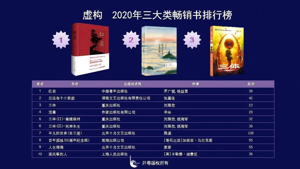 《红岩》成为虚构类第1名,同时也是总榜榜首。中国青年出版社出版,该版本从2009年即进入到开卷实体店渠道虚构畅销书榜单中,共上榜84次。《云边有个小卖部》和《三体》分别位列第2名和第3名。