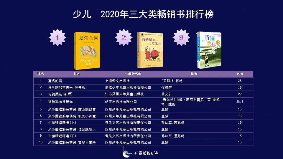 少儿类第1名《夏洛的网》,2014年8月上市,《夏洛的网》这部作品最早版本(2004年上市)在2007年9月进入开卷实体店渠道月度少儿畅销书榜单前30名中,截止目前该作品共上榜133次。《没头脑和不高兴(注音版)》《青铜葵花(新版)》分别位列第2名和第3名。