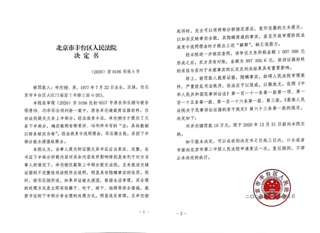 近日,丰台法院就单某诉鄂某、冯某合同纠纷一案公开宣判,并同时做出处罚决定,对裁剪证据、隐瞒事实的当事人单某罚款10万元。