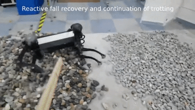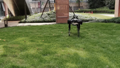 然后,研究人员可以将数字机器人在模拟中学到的东西移植到现实世界中的机器人大脑中。在上面的动图中,机器狗大脑中的“教练”正在与AI专家进行协调,以帮助机器狗在滑过石子路时保持其立足点。当专业人员用棍子推倒“绝影”时,机器狗在原地重新站立了起来。对任何环境下的四足机器人来说,这都是非凡的能力,更不用说是需要行走在石子路上的机器人了。当然,研究人员并不满足于让机器狗轻松过关,他们甚至还抓住机器狗头部的手柄,将它摔个脸着地。但每次这只机器狗都会重新站起来。这并不是因为研究人员编写了针对这种特殊攻击类型的反应代码,而是因为“绝影”现在已学会了就其行为策略咨询它的AI专家。当研究人员让机器人在光滑的表面或草地上而不是石子路上行走时,它也适应了这种情况。