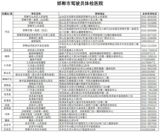 邯郸交巡警支队车管所综合服务大厅自主体检机因设备故障造成无法使用,现提醒广大群众如需办理期满换证、转入换证等需提交驾驶人身体条件证明的业务,请先至相关医院(如下图)进行机动车驾驶人体检。
