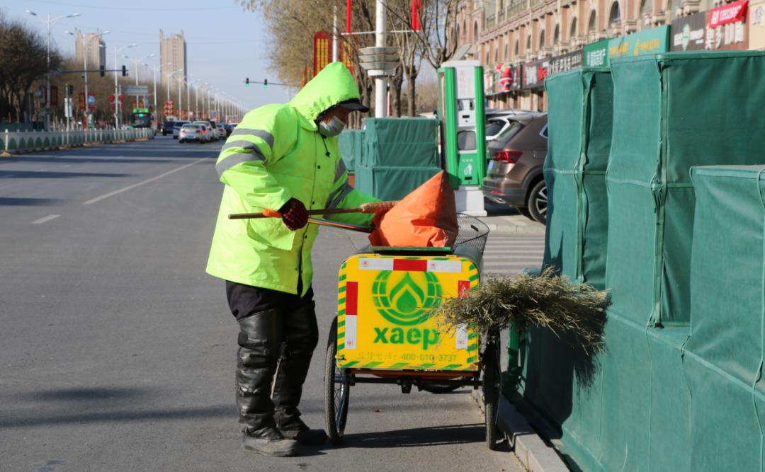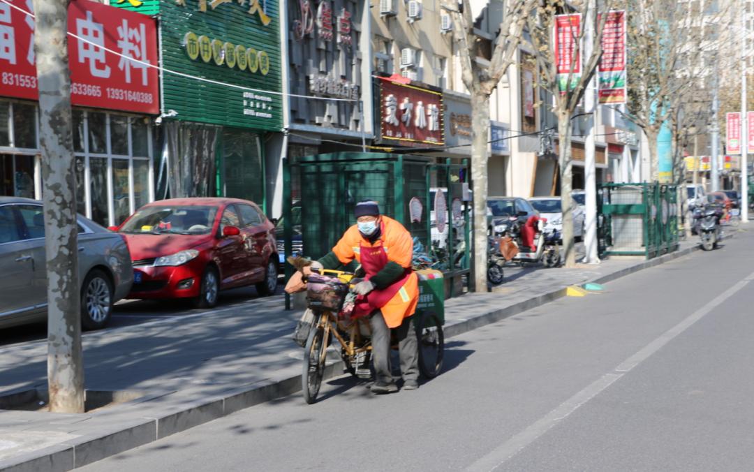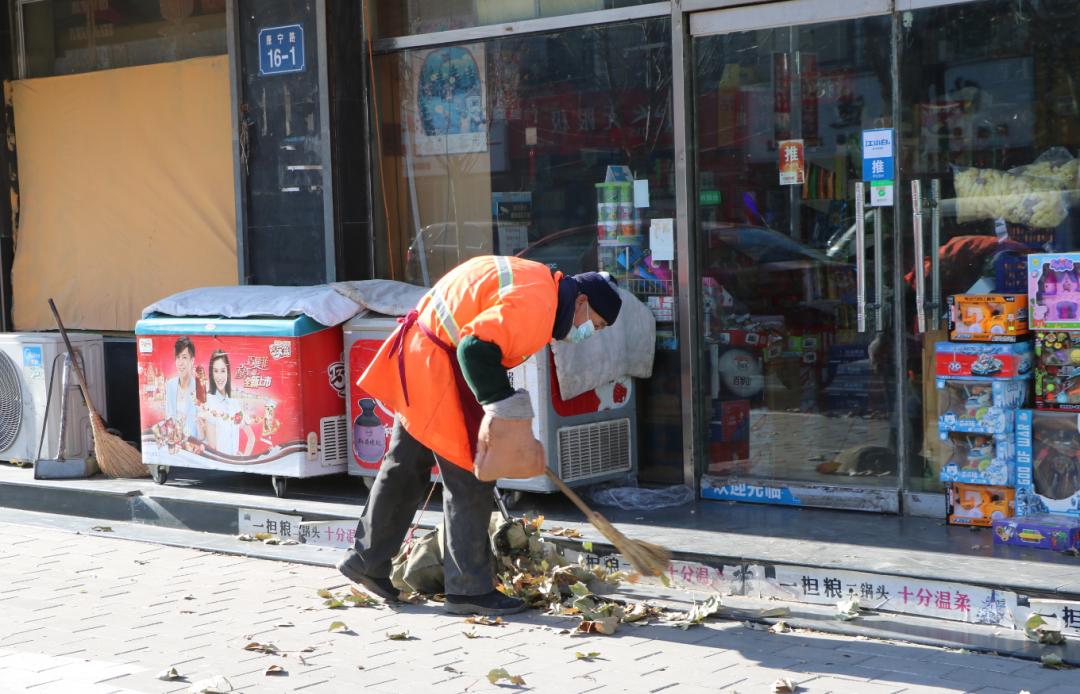 街道上,刺骨的寒风呼啸着身穿橙色工服的环卫工人们忙碌着