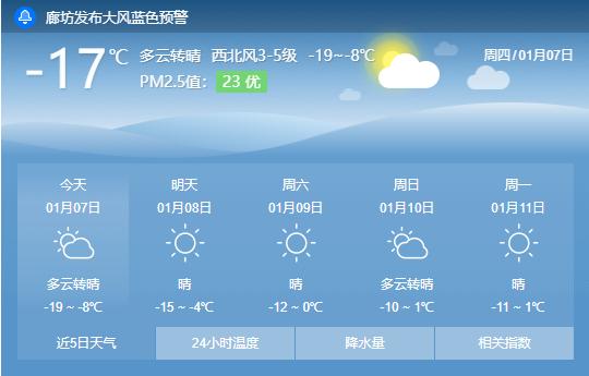 今天白天,多云转晴,西北风3-5级,最高气温-8℃;今天夜间,晴,西北风2-3级,最低气温-19℃。1月8日 晴,西北风3~5级,气温:-4℃~-15℃。