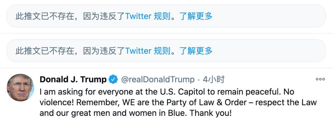 同时,推特还删除了特朗普有关美国国会大厦暴力事件的几条推文。