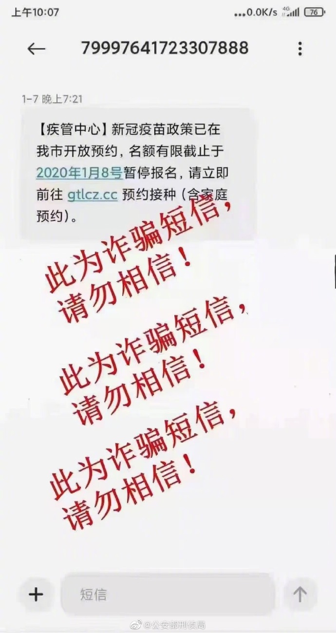 @公安部刑侦局 1月8日消息,国家反诈中心提醒:有不法分子借预约新冠疫苗接种发布虚假链接非法收集公民个人信息。国家反诈中心正在对虚假链接进行处置。请广大群众提高警惕,不要在陌生链接输入公民个人信息。
