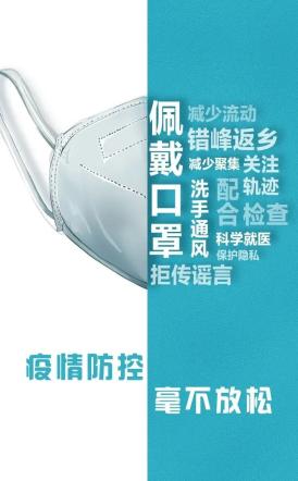 入冬以来,国内外疫情防控形势严峻复杂。随着春节临近,人员流动和聚集活动增多,疫情传播风险加大。为了您和家人的健康,我们再次提醒广大人民群众,牢固树立“每个人都是自己健康第一责任人”的理念,切实提高疫情防控意识,自觉做好个人防护,避免感染新冠肺炎疾病: