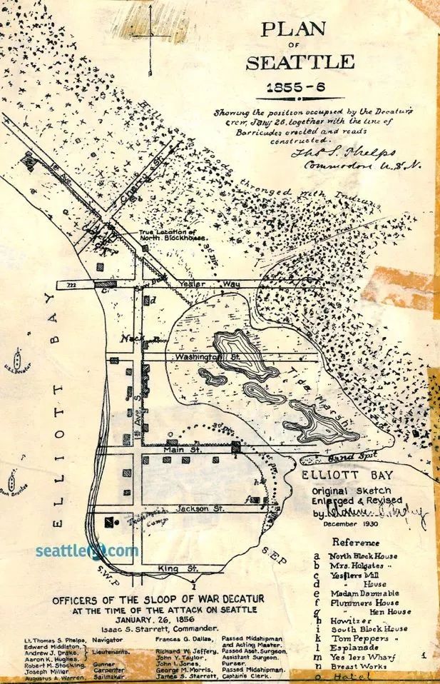 西雅图第一张城市平面图(1855年)亚瑟·丹尼不幸将西雅图的城址选在海潮平面下,令其成为一个“与海潮共舞” 的城市。