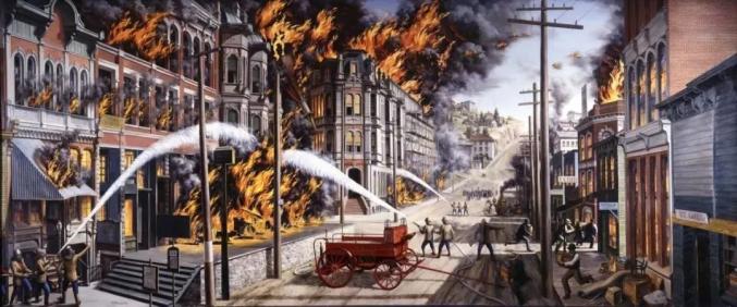 1889年6月6日下午2:39分,西雅图木匠乔纳森·爱德华·巴克(Jonathan Edward Back),失手打翻并碰巧引燃了橱柜店里熬胶的器皿,火势借助城市的木质人行道、失效的圆木给水管道,以及笨拙的消防志愿者,迅速将市中心31个街区付之一炬。