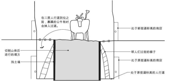 此时,填高后的路面与新建的二层建筑,只能通过建筑入口的砖拱联系。另外,街道虽已填高,但人行道还在一层的地面,人们在街上行走犹如置身于深深的峡谷之中,这给过街的居民和牲畜造成极大的不便。有报道记述当时居民过街的情形: