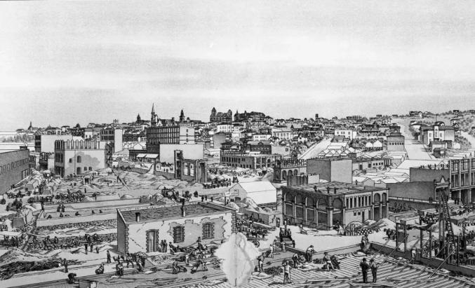 时间紧迫,城市的决策者为安抚商户的情绪,允许他们在过火的废墟和遗留的建筑上,即刻开始重建,条件是要求他们在二层建筑上当街开门。
