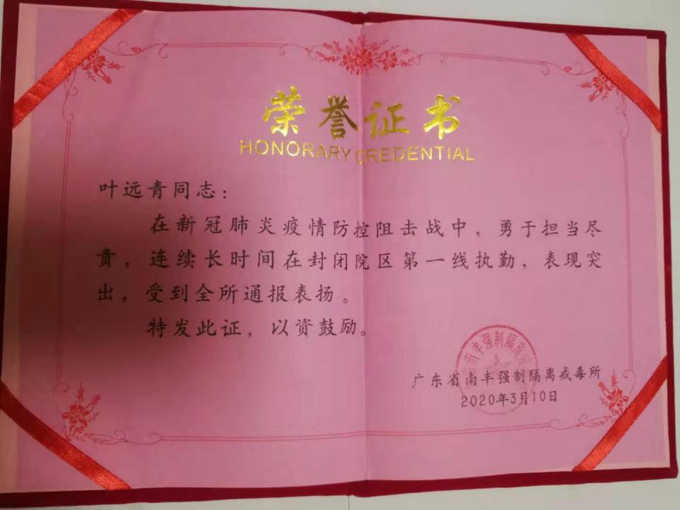 2020年农历新年,新冠肺炎疫情肆虐九州,为保证戒毒人员的生命健康安全,1月27日,省南丰所进入封闭执勤模式。得知这一情况后,叶远青主动请缨,从27日开始了为期7天的所内隔离备勤。封闭执勤7天后,在大队警力紧张的情况下继续请战,循环备勤执勤坚持一战到底。他是这么说的:“从警这么多年,我对各项工作都非常熟悉,2003年抗击‘非典’我也在,面对疫情我比年轻人更有经验”。