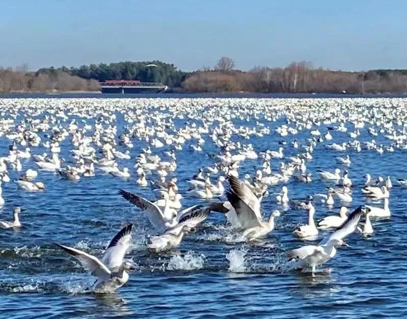 加拿大数万只雪雁迁徙,将整个湖面都铺满