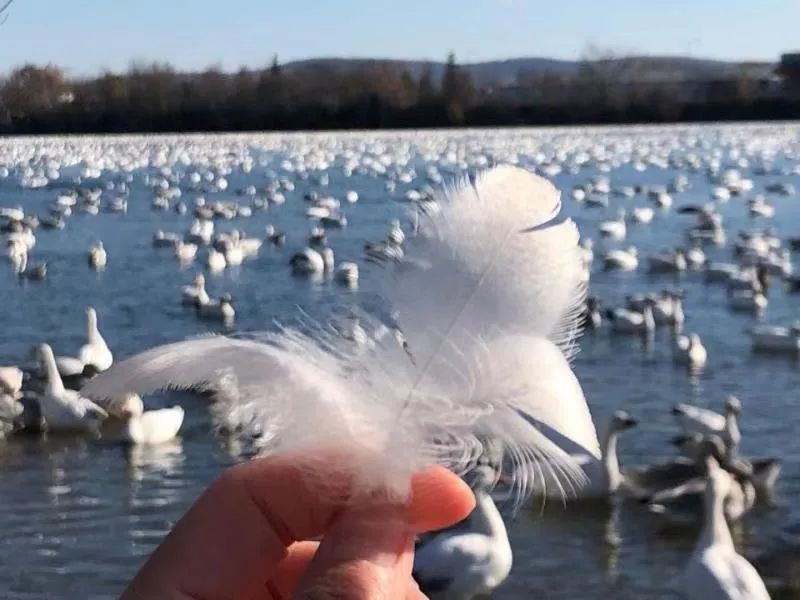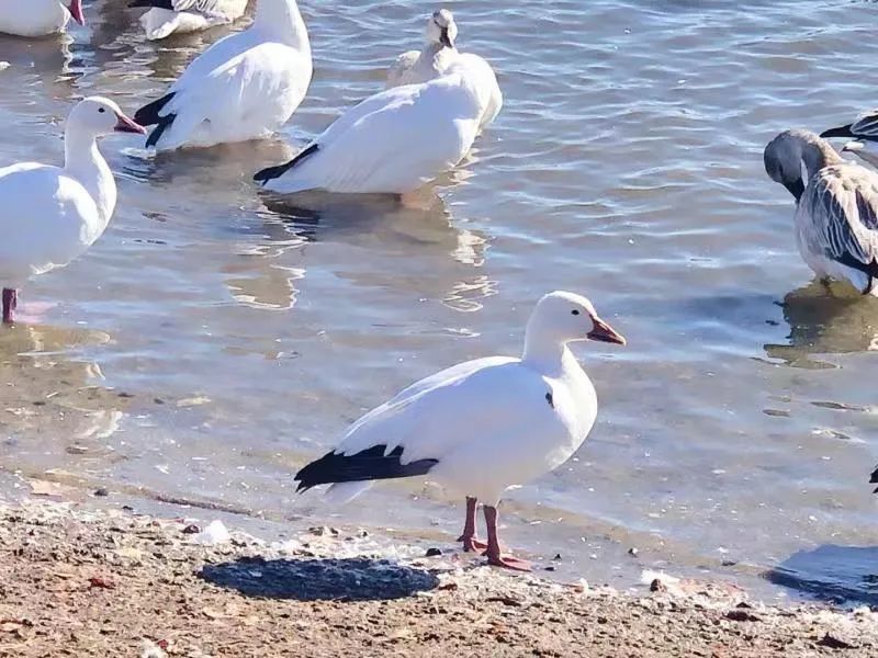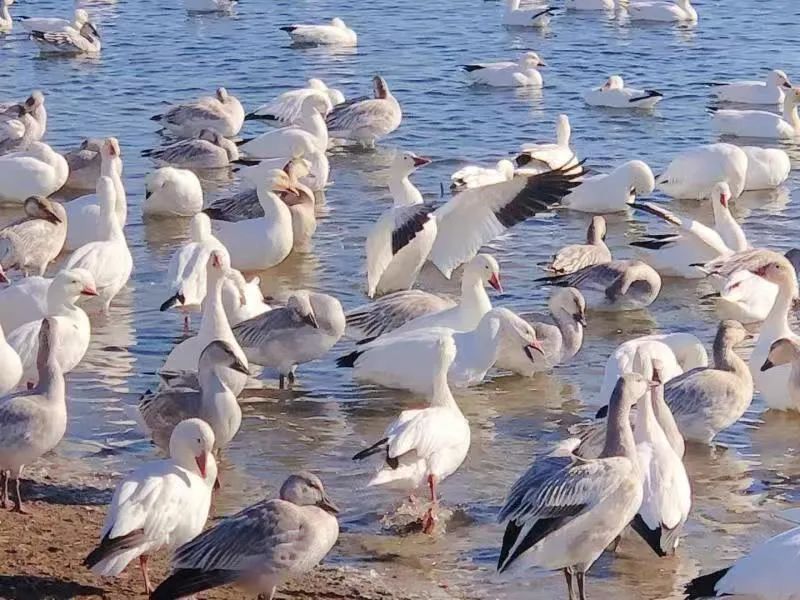 从远处看,它们呈现出大片大片的洁白,而走近看又分出了层次,有的是雪白色,有的是灰白色,而若忽闪起翅膀,可以看到翅尖部位是黑色的。它们在水面上低飞、嬉戏玩耍、晒太阳、理羽毛,也会走上堤岸,闲庭信步或单腿直立着闭目养神。它们不时成群地飞起,在天上盘旋。抬头看,满天都是无数密密麻麻的雪雁点点在移动、飘飞、旋转,一时间让人看得眼花缭乱。