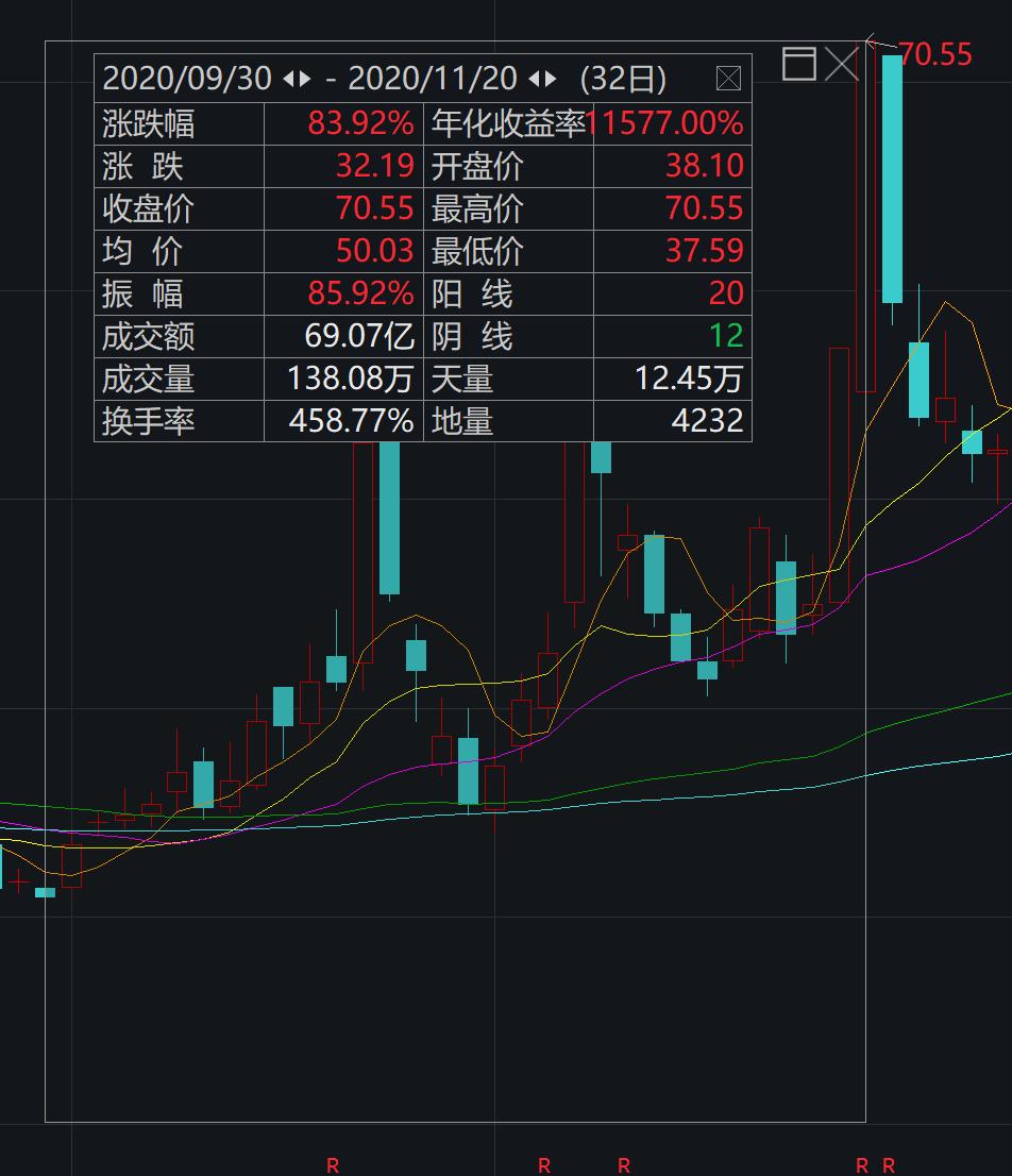 而值得注意的是,在暴跌之前,该股一个多月的时间狂涨近90%,暴跌前的两个交易日更是连续涨停,且在11月20日以70.55元的收盘价创出上市以来的新高。
