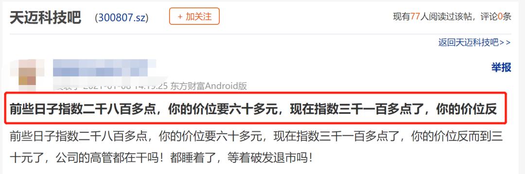 对此,有股民怒问:为何只涨指数个股却大跌?还有股民指出,指数二千八百多点,天迈科技的价位要六十多元,现在指数三千一百多点了,天迈科技的价位反而不到30?