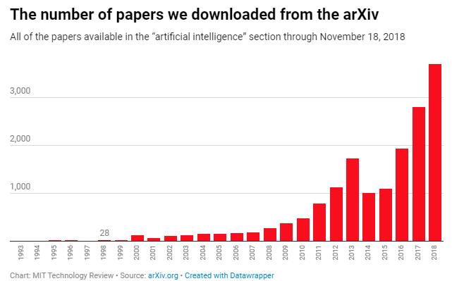 图源:MIT Tech Review2015 年,TensorFlow 开源。一年后,Facebook AI 又开源了基于 Python 的深度学习框架 PyTorch。今天,TensorFlow 和 PyTorch 已经成为使用最广泛的框架。通过不断的版本更新,谷歌和 Facebook 为机器学习社区带来了极大便利。自定义库、软件包、框架和工具的爆发式增长,使得更多人进入了 AI 领域,也为 AI 研究带来了更多人才。