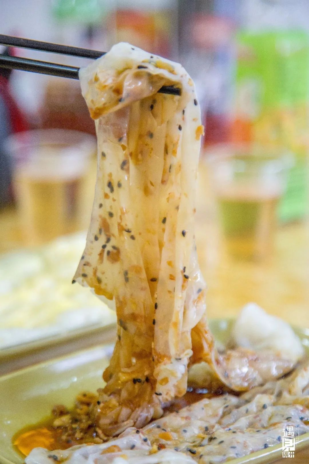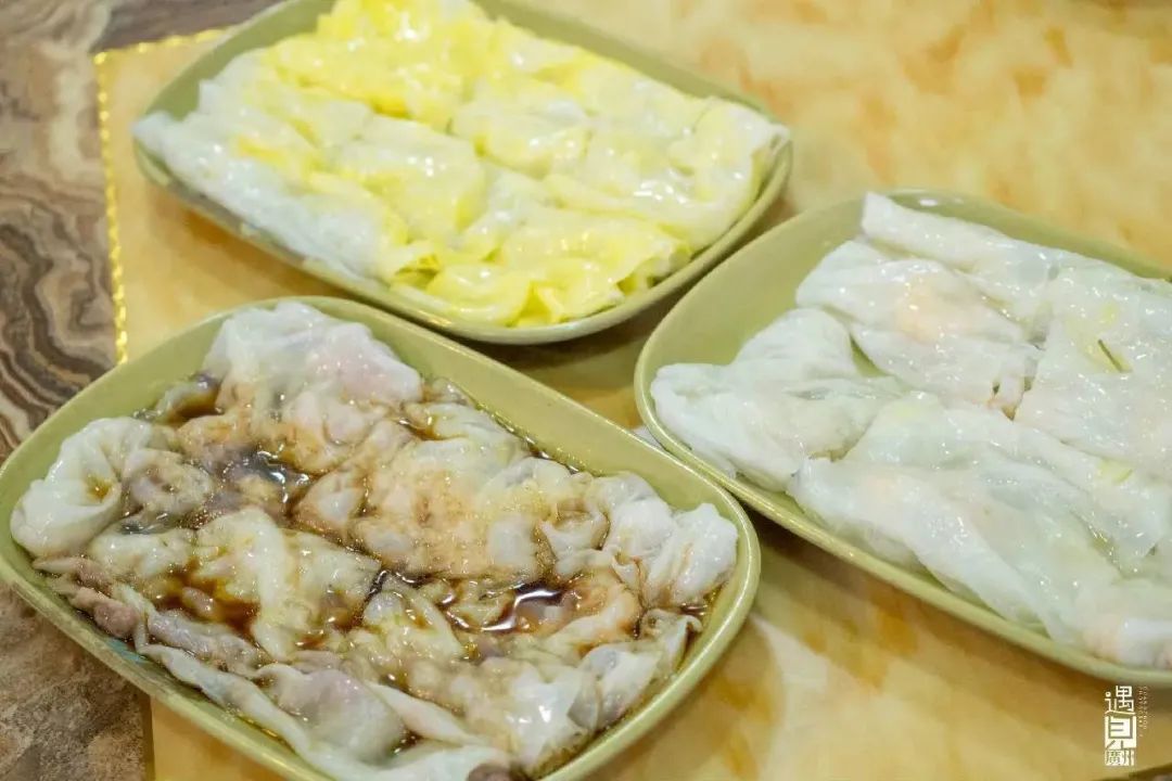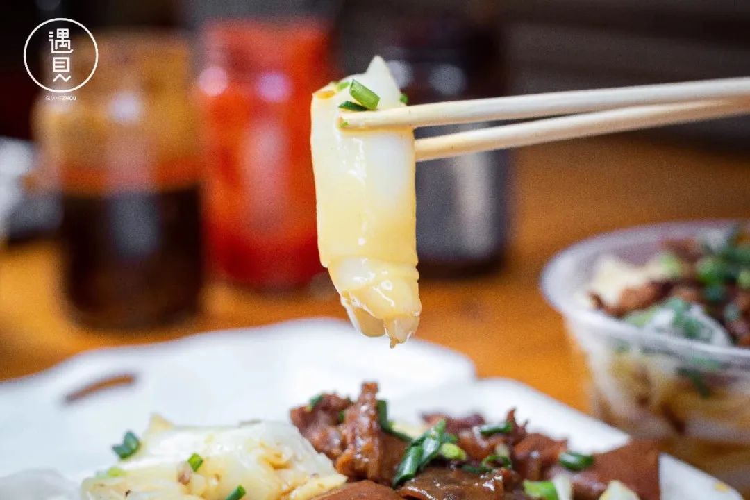 肠粉皮薄可透光,馅料在粉皮下若隐若现,米香、肉香与酱油的完美融合,香气诱人。