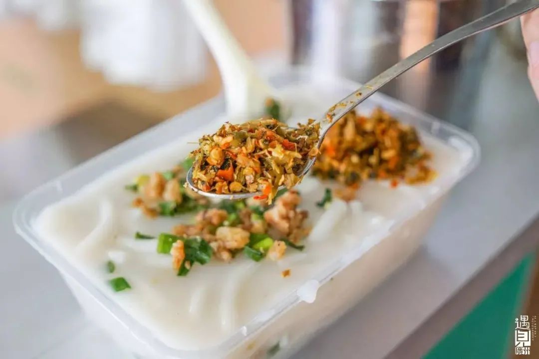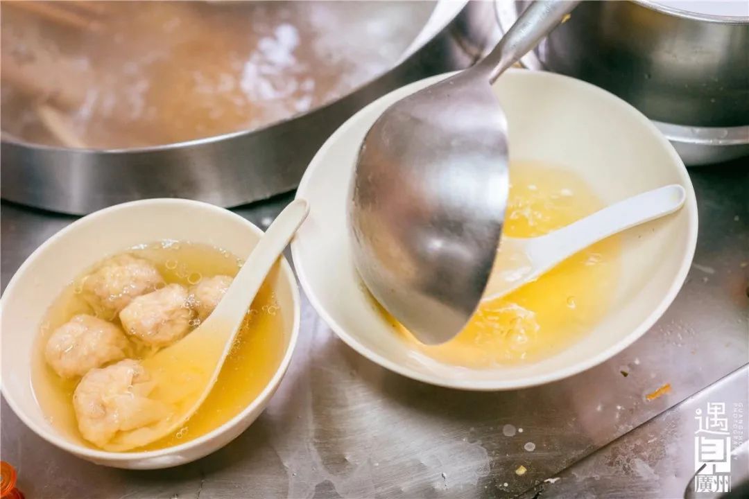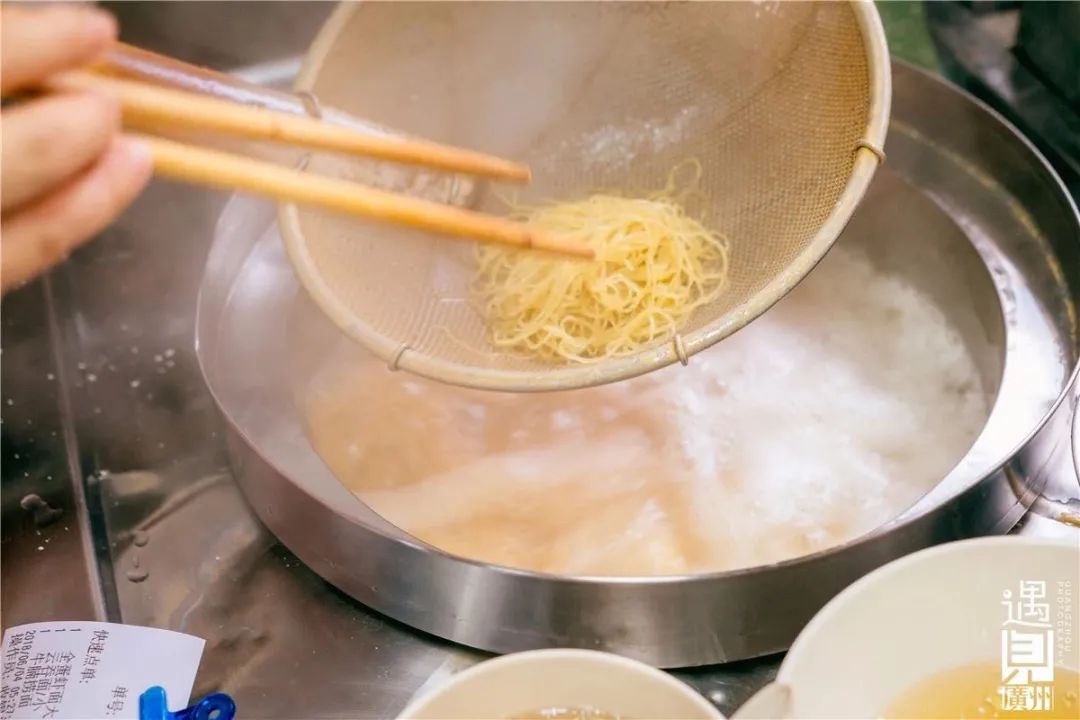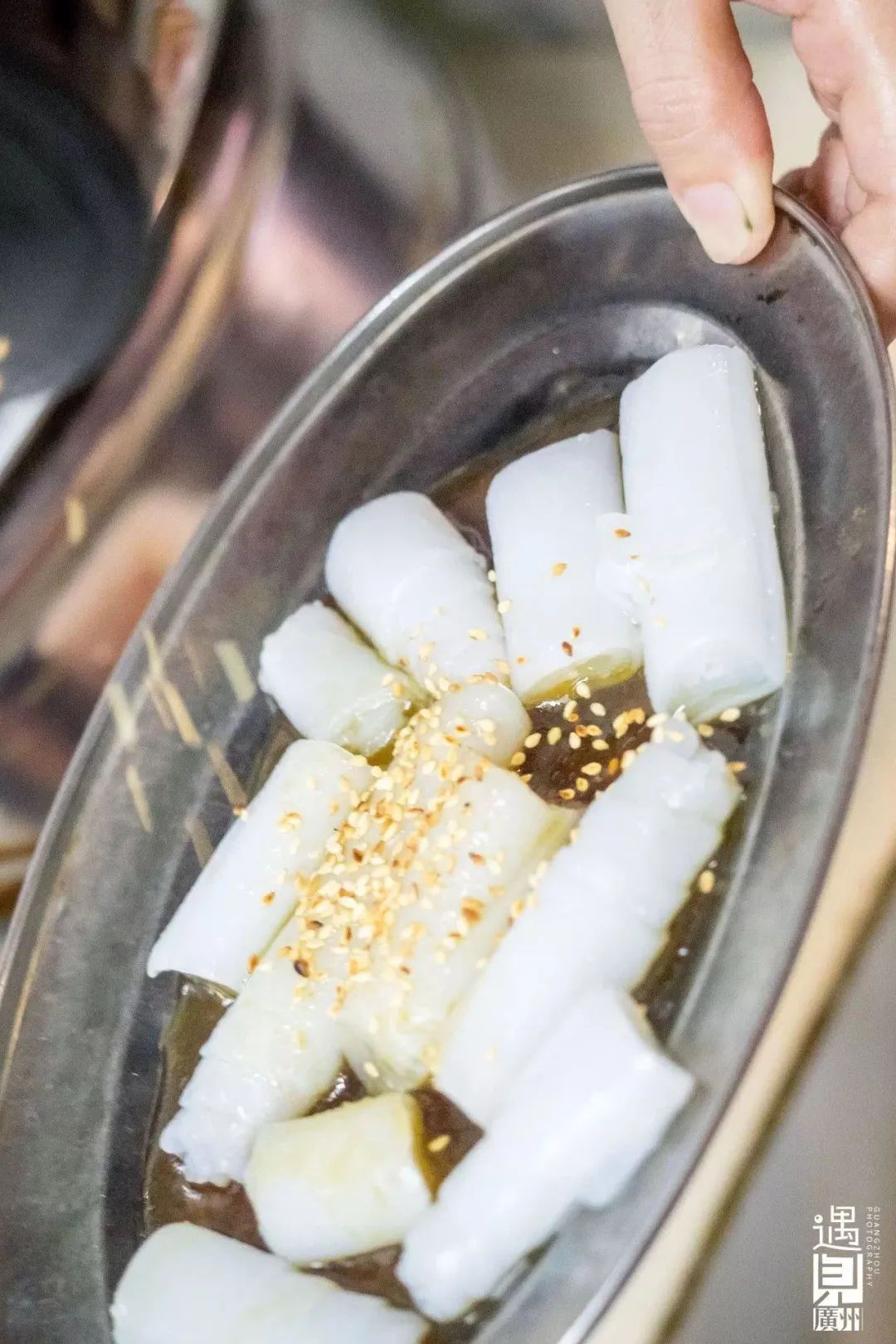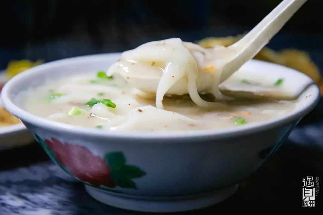 淋上熬煮的米浆汤,撒上葱花、辣萝卜粒,米香浓郁,简简单单却浓缩了原汁原味的广州味道。