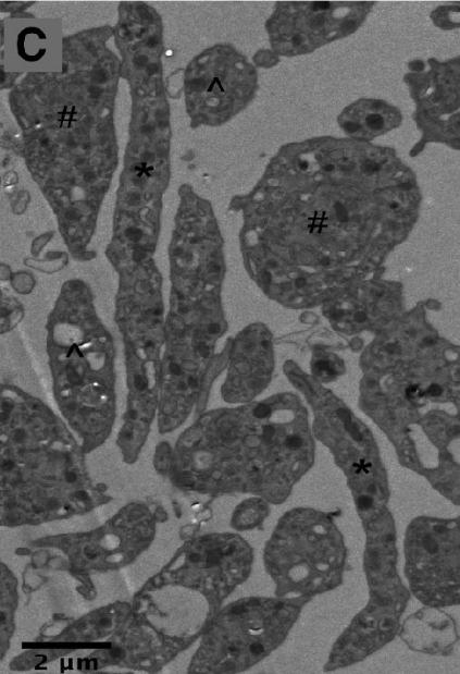 电子显微镜下的前血小板(#和*标注)与血小板(^标注) | 图源:Machlus K R, Italiano J E.新生成的前血小板会立刻穿过血窦壁进入血管内,其内的微管还会继续延伸,促使它们再次分裂,形成我们熟悉的血小板。