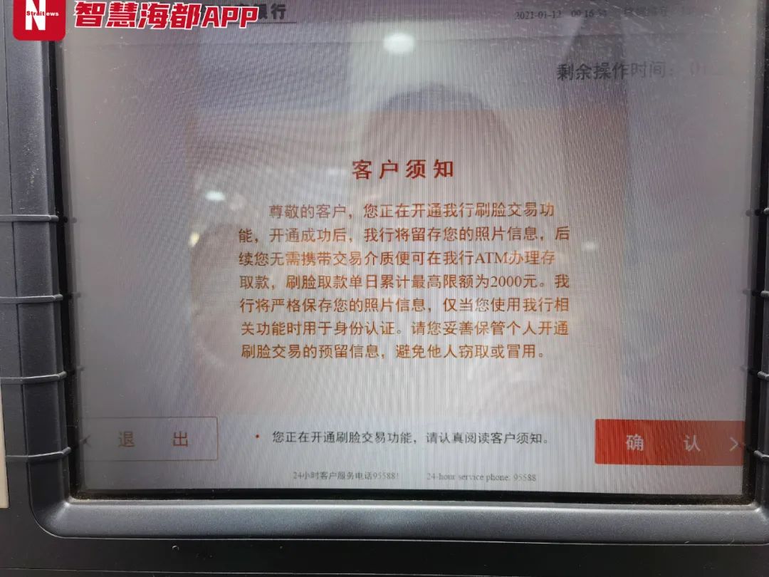 昨日上午,海都君来到该银行位于乌山西路的自助银行服务区,这里设置了2台ATM机。在其中一台ATM机上,海都君插入银行卡并输入密码后,ATM页面跳出一则“客户须知”,提示正在开通刷脸交易功能。“客户须知”显示,刷脸取款单日累计最高限额为2000元。