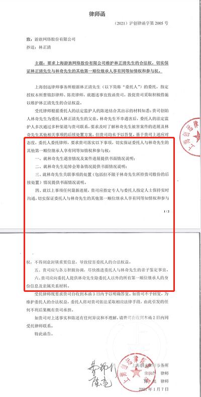 该网友还公布了疑似林奇非婚子的出生证明及律师函。律师函中提到,要求游族公司出具书面情况说明,说明林奇的遇害情况、案件进展情况、追悼会筹备情况及林奇关联事项的处置情况。并要求游族网络积极协调,推动林正清与林奇的亲子鉴定,并要求游族网络保证其与其他第一顺位继承人享有同等知情权和参与权。