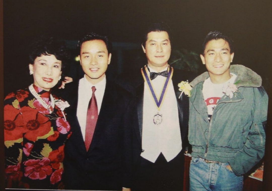 ▲潘迪华(最左)和张国荣关系非常好,当年张国荣参加歌唱比赛时,潘就给了他最高分。此后,《重庆森林》、《堕落天使》、《春光乍泄》、《2046》、《花样年华》……个个都是华语影坛里举足轻重的代表作,也都在里面夹带了很多专属于“张叔平”的个人符号。