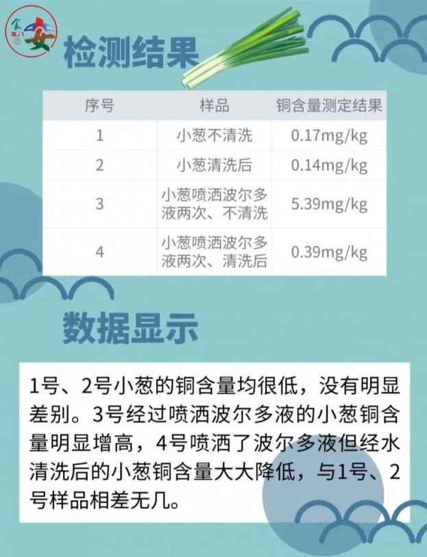此外, 2020年6月,厦门市食品药品质量检验研究院食品理化科副主任技师张淑琼采用电感耦合等离子质谱法,对小葱喷洒波尔多液后的残留问题进行了分组实验。