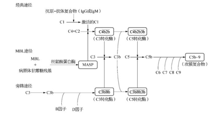 3、 补体系统包括三条主要途径——经典途径、凝集素途径(MBL途径)、旁路途径,其中三者交集C3具有重要地位。