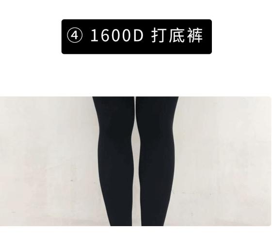 其中,打底裤1,2,3的区别在于,厚度不一样,分别为600D,1600D和2800D。D是指纤维的纤度单位,D值越大,厚度越大。其中2和3内侧加绒。