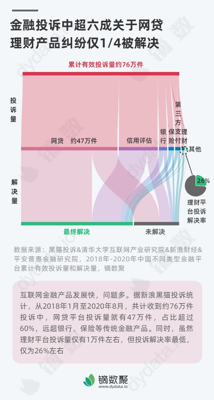 互联网金融产品发展快,问题多。据新浪黑猫投诉统计,从2018年1月至2020年8月,共计收到约76万件投诉中,网贷平台投诉量就有47万件,占比超过60%,远超银行、保险等传统金融产品。同时,虽然理财平台投诉量仅有1万件左右,但投诉解决率最低,仅为26%左右。
