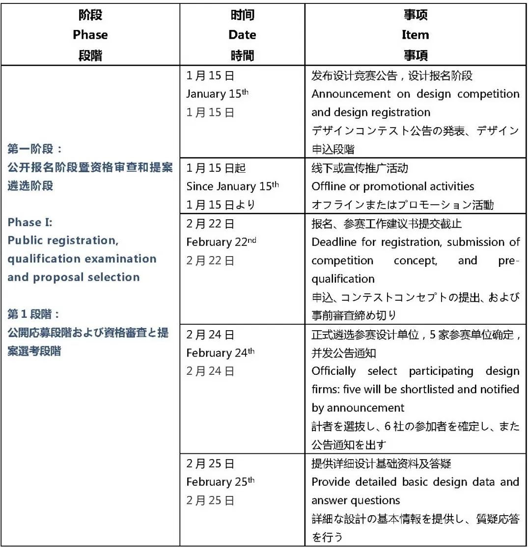 All design firms, whether by means of fixed invitation or public registration, are required to submit the work proposal, which contains a brief introduction of overall strength and features of such firm, a performance introduction of similar projects in the past, and a description document of no more than 3 pages to express the cultural understanding and conception intention of the Project (in any form).