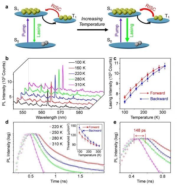 国科大博士生导师、中科院光化学重点实验室赵永生课题组近年来一直致力于有机固态激光器的理论研究(Acc. Chem. Res. 2016, 49, 1691-1700)和应用开发(Nat. Commun. 2019, 10, 870)。针对有机光学增益材料载流子迁移率不平衡带来的极化子损耗问题,他们构筑了具有平衡双极传输特性的电荷转移复合物增益介质,首次实现了这类材料的受激辐射(Sci. Adv. 2019, 5, eaaw2953),为开发新型双极传输激光材料提供了有价值的参考。然而对于最具有挑战性的三重态损耗,常规思路是利用三重态的化学淬灭来抑制三重态相关损耗。如果能够有效利用三重态的能量,不仅能够降低损耗,还将“变废为宝”,从而显著提高有机固态激光的效率。