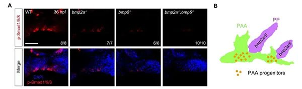 2020年12月17日,国科大博士生导师、中科院动物研究所王强研究员课题组在Development在线发表了题为Pharyngeal pouches provide a niche microenvironment for arch artery progenitor specification的研究论文。该研究以斑马鱼为模式生物,结合细胞谱系追踪、组织特异性消除和突变体制备等实验技术探讨了咽囊对弓动脉发育的调控作用,发现咽囊直接与咽区中胚层接触,并通过表达和分泌BMP2a与BMP5,激活咽区中胚层细胞的BMP活性,为其特化为弓动脉前体细胞提供了一个合适的微环境。BMP信号胞内效应因子Smad1/5/8在弓动脉前体细胞中存在动态的磷酸化激活。咽囊能分泌表达多种BMP,咽囊缺失后,咽区中胚层的BMP活性被显著抑制。在缺失咽囊的胚胎中重新激活BMP信号,能很好地挽救弓动脉前体细胞特化的缺陷。此项研究表明,咽囊在弓动脉发育过程中建立了一个前体细胞特化的微环境,对弓动脉发育具有直接且重要的作用。同时,这些研究揭示了咽囊的起源和其通过组织间相互作用调控头部组织器官发育的重要功能机制。