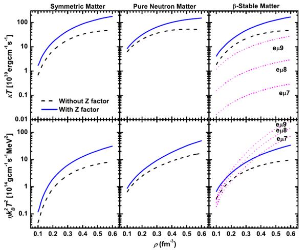 中子星作为一类致密天体,其内部是具有极高密度的丰中子物质。因此,致密物质输运性质的可靠信息,对于理解恒星热演化和引力波辐射驱动的r-模不稳定性至关重要。国科大师生所在的中科院近代物理研究所课题组,首次阐明了核子短程关联在核物质热导率及剪切黏滞性中的作用,进而说明了其在中子星输运性质及r-模不稳定性中的作用。研究者认为即使在非常低的温度(106K)下,剪切黏滞性也不足以使得快速转动的中子星的r-模震荡稳定。这一点扩充了我们对于脉冲星物理中的r-模不稳定性的认知。