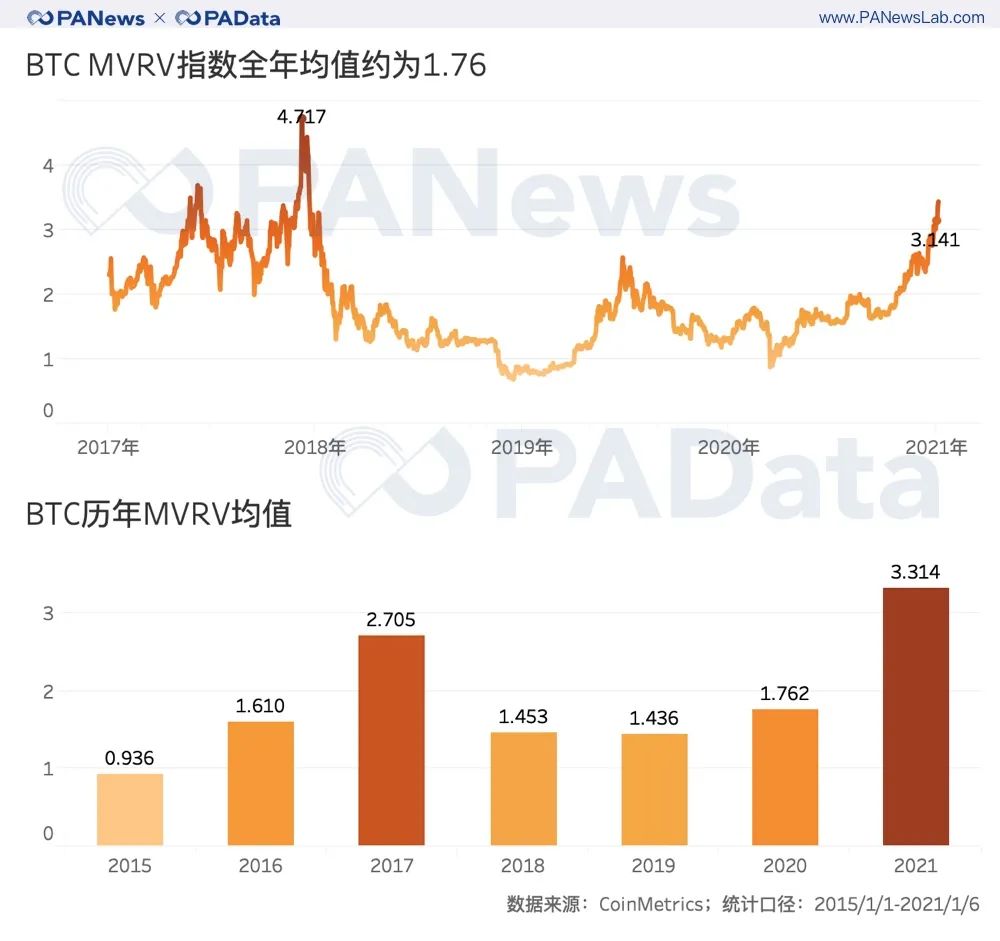 全年量价关系并非完全对应,就整体上而言,币价上行趋势连贯且显著,但交易量则呈波段分布,尤其是今年6月至9月期间,币价稳中有升,但交易量却有所下跌。在BTC持续放量上行,并以29001.72美元的价格刷新历史最高价格的背景下,市场普遍看好BTC在2021年延续上涨趋势。其中一个判断依据就是MVRV。该指数是一种反映长期投资者偏好的指数,代表流通市值与实现市值的比值,如果大于1,意味着当前价格高于市场参与者的总体价值共识,定价被高估,且数值越大意味着定价被高估的程度越高,反之亦然。截至12月31日,MVRV指数约为3.141,低于2017年12月7日4.717这一前高。