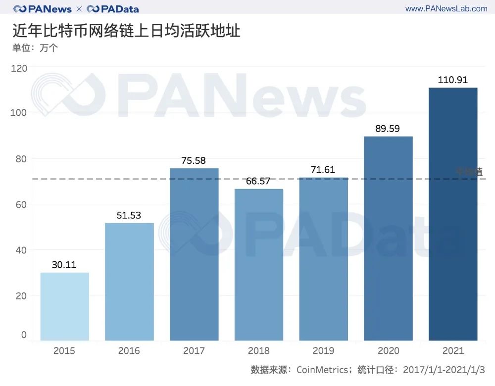 今年,链上日均活跃地址数达到了近年来的一个小高点。根据统计,今年日均活跃地址数较2019年上涨了约25.11%,较上一轮牛市时期的2017年上涨了约18.54%,较五年前的2015年则已经翻了近3倍。