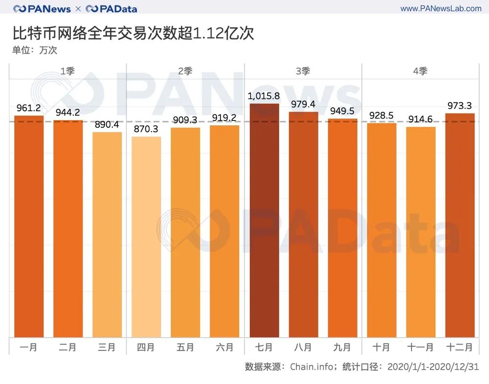 全年链上结算1.12亿次,结算金额超5.36亿BTC链上结算效率是衡量区块链发展和未来应用的重要指标。根据统计,今年全年链上结算次数累计突破了1.12亿次,较2019年减少了约700万次,跌幅约为6.25%,基本持平。全年月均链上结算937.97万次,其中,7月是链上结算次数最多的一个月,达到了1015.8万次。而且,与2019年情况相似,今年链上结算次数与币价没有统计相关性,也即,影响链上结算次数的并不是币价起伏。