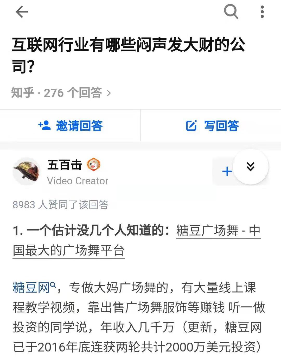 闷声发大财糖豆广场舞这个应用,很多年轻人都没听说过,可它却是投资人眼中的香饽饽,也是“闷声发大财”的代表。