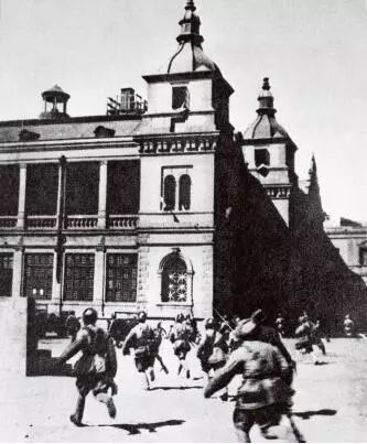 ▲1949年1 月25日,东野将士攻入国民党天津警备司令部(原日租界大和公园内日本公会堂,今天津和平区八一礼堂附近)。在强大的攻势和猛烈的炮火、重重的包围下,到1月15日下午3点,历经29个小时,共歼敌13万人,活捉天津守敌司令陈长捷等人,迎来了天津战役的胜利。