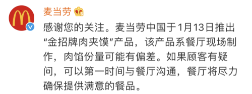 对此,@麦当劳 官微14日回应称,该产品系餐厅现场制作,肉馅份量可能有偏差。一名客服称,以实物为准,目前针对网友普遍反映的情况,需要一对一进行处理。此外,麦当劳客服回应@沸点视频 称,以实物为准,“如果是普遍的现象,我们也是挨个处理”。