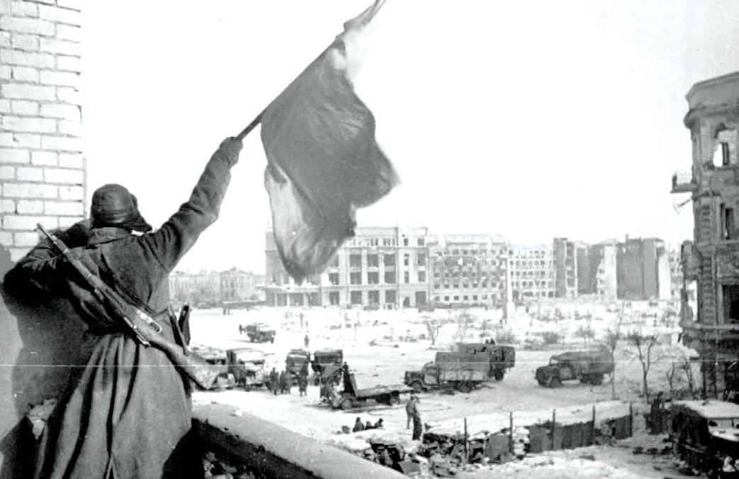 ▲ 经过几个月的鏖战,斯大林格勒终于解放了,红色旗帜在广场上迎风飘扬当时,斯大林格勒一片狼藉,借用停战前一位德国军官的话来说:“这个鬼地方连动物也待不住……只有军人才能忍受下来。