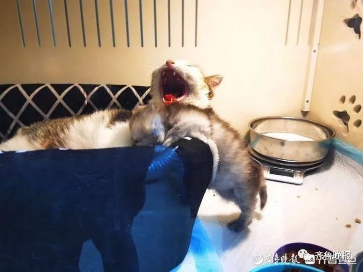 一颗浅灰色的扁平小脑袋上,两只圆滚滚的大眼睛正面对着镜头充满好奇。在26℃的育婴室内,见到陌生访客的“平安”欢腾地爬上爬下,但不过五六分钟,它就又趴回母猫(中华田园猫)怀里吃奶去了。