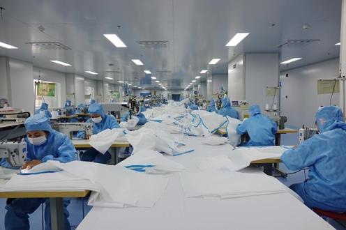 ▲ 2020年2月,新兴际华集团所属军队服装生产企业紧急转产医用防护服。2月5日产量7850套,9天内快速提升至4.4万多套,圆满完成国务院“2月14日形成防护服4万套天供应能力”的指令性任务。